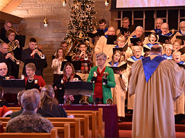 The “All Choir Sunday” services are an opportunity for all of our musical groups – vocal choirs, hand bells, and brass musicians – to come together in one worship experience. They are celebrated as part of both sanctuary worship services on the Sunday before Christmas and on Easter Sunday.
